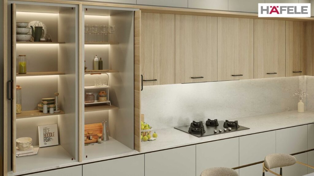 Enabling this seamless experience is Hafele’s new introduction, the Hide Away Pocket Door System, which offers convenient and hassle-free access to your cabinet contents. The doors in this system hide away neatly into the pockets between the cabinets giving you complete and unobstructed access while also saving space which would be otherwise occupied by open cabinet doors.